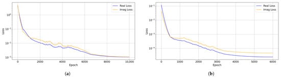 Figure 7 presents the loss curves during training for the two methods. GVW-PINN exhibits a faster decline in loss during the early stages, indicating more efficient optimization. Its real and imaginary loss components decrease smoothly and reach low values within fewer epochs. By the end of training, GVW-PINN achieves a lower final loss compared to the standard PINN. These results demonstrate not only the faster convergence of GVW-PINN but also its superior final accuracy.