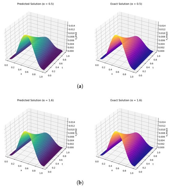 Figure 8 illustrates the performance of the proposed GVW-PINN method in solving the time-fractional diffusion equation under different fractional orders . The predicted surfaces demonstrate a close agreement with the analytical solutions across the tested values of . The surfaces are smooth, the peak amplitudes align accurately with the exact solutions, and the temporal decay rate is well preserved. This indicates that the gradient variance weighting strategy enhances both the accuracy and stability of the training process, particularly in challenging fractional-order regimes.