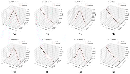 Cross-sectional comparisons of the predicted and exact solutions of the one-dimensional time-fractional diffusion equation at different spatial-temporal points for fractional order . The solid black lines denote the exact solutions, while the red dashed lines represent the predictions. (a–d) corresponding to the standard PINN. (e–h) corresponding to the GVW-PINN.
