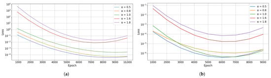 Figure 10 shows the training loss evolution for the standard PINN and the proposed GVW-PINN across different fractional orders. While the standard PINN initially reduces the loss, it soon exhibits slow convergence, and frequent stagnation at relatively high loss values, particularly for higher fractional orders (), indicating a clear inability to capture the dynamics of stronger fractional effects. In contrast, GVW-PINN demonstrates faster and smoother loss decay for all values, achieving reductions up to two orders of magnitude compared to PINN, and reflecting more stable optimization and better generalization. Overall, GVW-PINN converges within fewer epochs, reaches consistently lower final loss magnitudes, and maintains robust performance across all tested fractional orders, significantly enhancing both accuracy and training stability for fractional diffusion problems with pronounced nonlocal effects.