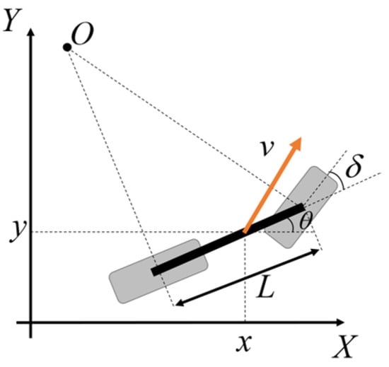 Parking maneuvers are typically performed at low speeds, where vehicle dynamics can be reasonably neglected. Especially, a constant low speed is assumed to simplify the kinematic modeling, as parking maneuvers are performed under quasi-static conditions where variations in longitudinal velocity have a negligible effect on the path geometry. This assumption focuses the analysis on the steering-related kinematic constraints that dominate low-speed parking behavior, while the resulting trajectories can later be followed by a velocity-adaptive controller in practical implementations. Under this assumption, the vehicle is modeled using a simplified bicycle model with three degrees of freedom. The states of the vehicle are described by its center position (x, y), heading angle θ, longitudinal velocity v, wheelbase L, and steering angle δ, as shown in Figure 1. The governing kinematic equations of the bicycle model are expressed as follows: