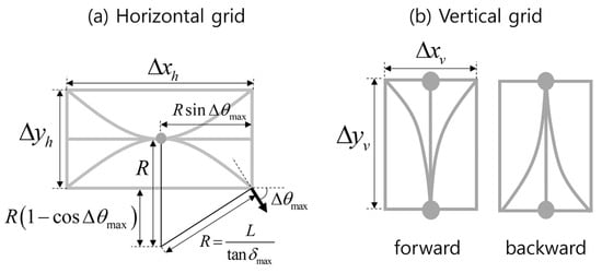 For the horizontal grid, the grid dimensions (Δxh, Δyh) are derived from the achievable displacements under the minimum turning radius R, assuming constant vehicle speed over a short time horizon and a nonzero heading change Δθmax: