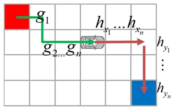 The first two terms, G(n) and H(n), originate from the A* algorithm and represent the travel cost and heuristic cost, respectively, which contribute to minimizing the total path length, as shown in Figure 3. G(n) denotes the accumulated travel cost from the start grid to the current grid n: