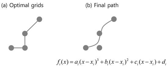 The discrete sequence of grids obtained from the search process produces a collision-free and kinematically feasible grid sequence, but the trajectory is still piecewise linear with abrupt changes in direction. Such discontinuities are impractical for real vehicles due to steering limitations and may lead to excessive control effort. To address this issue, the discrete path is refined through cubic spline interpolation, yielding a continuous and smooth trajectory suitable for vehicle tracking.