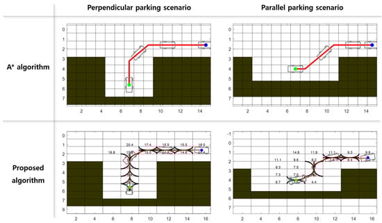 Figure 7 shows the comparison between the baseline A* algorithm and the proposed algorithm in perpendicular and parallel parking scenarios. Blue and green markers denote the start and destination positions, dark cells represent obstacles, and the red lines indicate the selected paths. A* yields collision-free, piecewise-linear routes with abrupt heading changes, without guaranteeing curvature continuity or terminal-pose satisfaction. In other words, the A* path is geometrically valid but not executable for steering-constrained vehicles. The proposed method, on the other hand, enumerates kinematically feasible motion candidates, shown as black curves, and selects the minimum-cost trajectory at successive waypoints, with numeric labels indicating the evaluated costs. The resulting paths are curvature-bounded, maintain obstacle clearance, and smoothly align with the target pose in both scenarios. In the perpendicular case, the vehicle passes through the narrow entry with adequate clearance and performs an S-shaped heading transition that respects turning-radius limits, while the evaluated cost generally decreases as the vehicle approaches the goal. In the parallel case, the proposed planner first establishes proper lane alignment and then converges to the target pose without abrupt steering. Across both tasks, the proposed method improves kinematic feasibility, clearance, and terminal-pose satisfaction relative to the A* baseline.