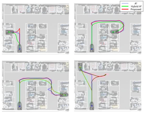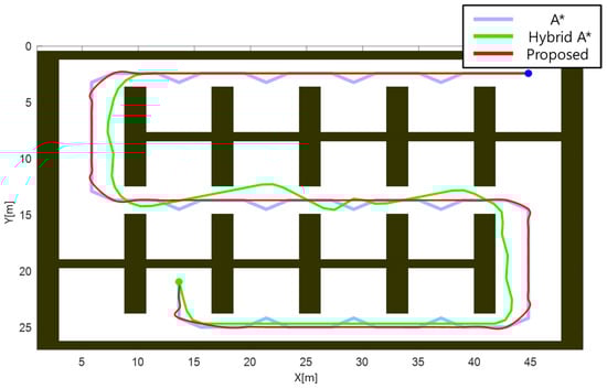 Figure 8 shows the results of A*, Hybrid A*, and the proposed algorithms in a structured parking-aisle environment. The A*-based path, shown in blue, is collision-free but involves frequent and unnecessary steering changes, which produce highly tortuous trajectories that skim obstacle boundaries and neglect curvature limits. The Hybrid A*-based path, depicted in green, enforces nonholonomic motion to some extent and smooths corners for feasibility, yet it still exhibits unnecessary weaving and lateral excursions, with portions running close to obstacles, thereby increasing collision risk.