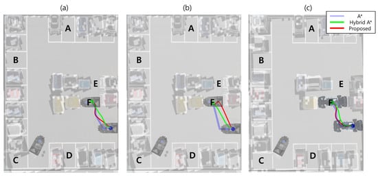 Figure 10 shows the experimental results in dynamic and non-standard parking environments. Figure 10a is for the case where another dynamic agent intermittently moves across the parking lane near Slot C and several non-standard parallel parking slots introduce irregular boundaries. Figure 10b presents the results in the same environment but with an increased initial velocity of 2 m/s. Figure 10c shows the case where the test vehicle has an extended wheelbase and a narrower track width, i.e., 71.3 cm and 31 cm, respectively, with an initial velocity of 1 m/s, resulting in more restrictive turning capability. In all experiments, the sixth parking slot was predetermined as the target. All three planners, including A*, Hybrid A*, and the proposed method, generated reversal-free trajectories toward Slot F, which had the minimum cost while avoiding the dynamic agent and maintaining sufficient clearance relative to the vehicle size. However, each planner produces a distinctly different trajectory shape.