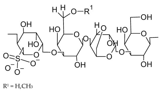 Porphyran is a water-soluble, sulfated polysaccharide composed of repeating units of galactose and 3,6-anhydrogalactose. The chemical structure of porphyran is presented in Figure 2. These monomers are linked by alternating α-1,4 and β-1,3 glycosidic bonds [23].