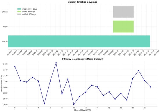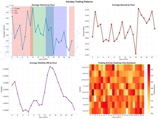 Figure 1 displays temporal coverage, showing consistent 24/7 data availability with minor exchange maintenance gaps. Peak activity occurs at 07:00 UTC during European-American session overlap.