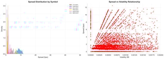 Microstructure extraction processes order book snapshots across 50 depth levels, computing volume-weighted spreads, order imbalance ratios, and depth concentration. Figure 3 shows median spreads of 1.55 basis points with the 95th percentile at 9.14 bps.
