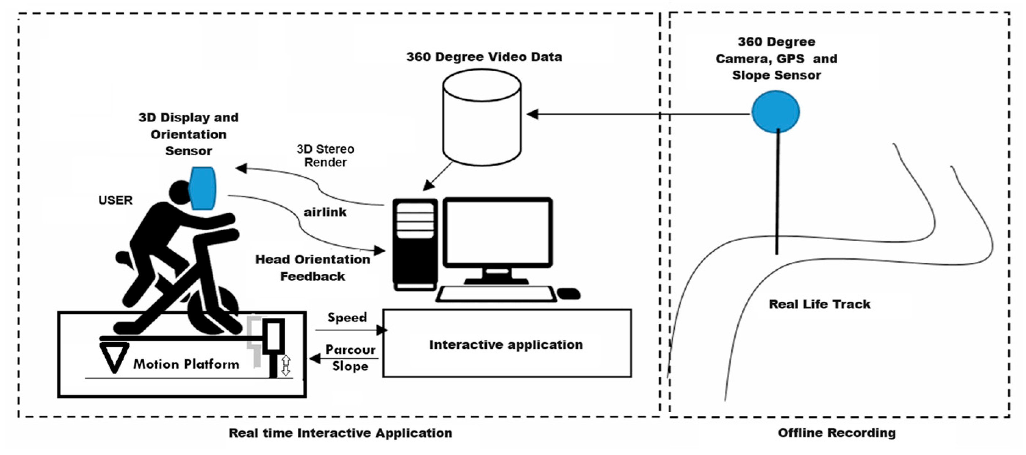 The virtual reality equipment used in this project allows users to experience a three-dimensional visualization of the real physical space in proportion to their movements. This system consists of several subsystems for indoor exercises with the help of AR. The mechanical system allows users to engage in actual cycling, walking, or driving practices that closely resemble those in the real environment, with the added benefit of electromechanical feedback. The user can adjust the angle and position of the bicycle by performing an activity on a mechanical system using virtual reality goggles that provide visual and head movement feedback. A bicycle can be ridden or driven by head movements and mechanical performance taken from the real environment. The user sees only a certain part of the 360-degree video stream, which is given to each eye separately, allowing them to obtain a three-dimensional feeling and, as these images are renewed according to head movements, it is easier to accept. At this stage, the natural perspective and distance focusing techniques of the human eye are also used. The system block diagram is shown in Figure 2.