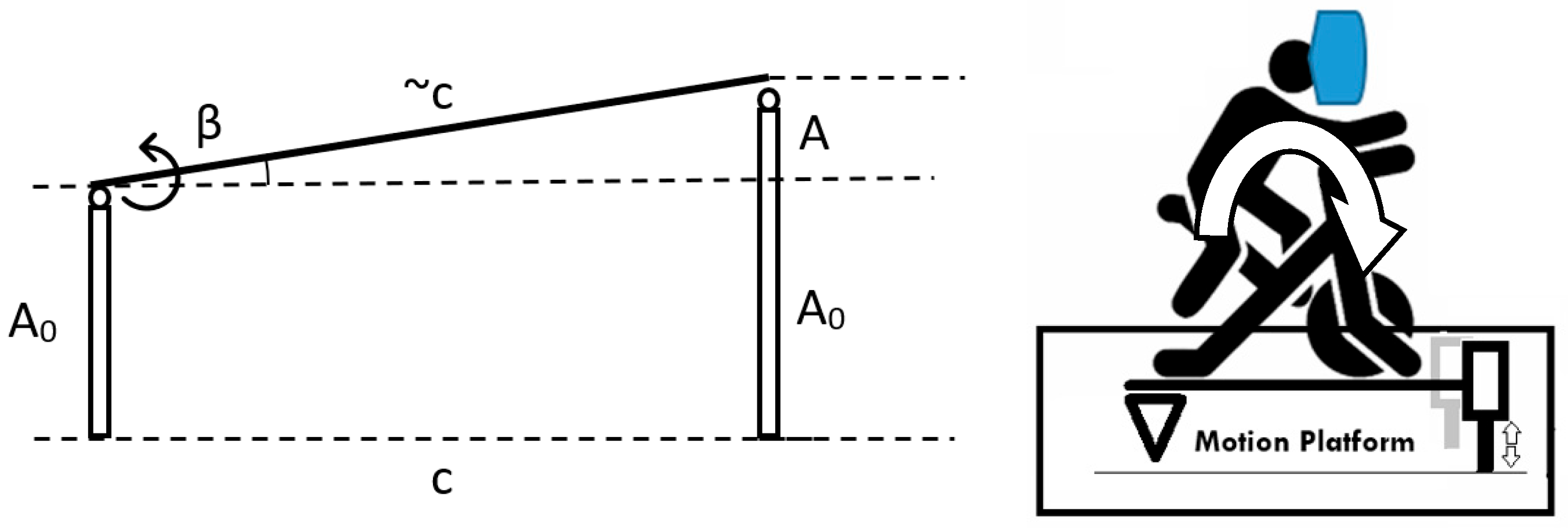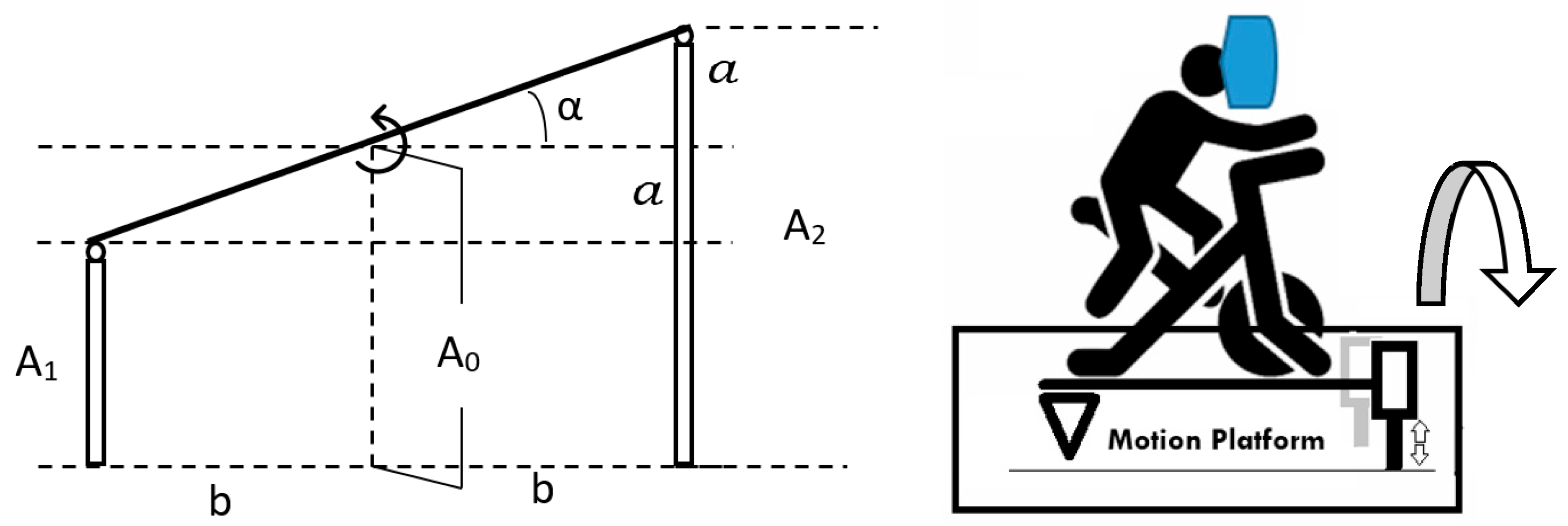 The study requires the mathematical modeling of the mechanical bicycle system and subcomponents such as the pedal forcing system. The analysis must extract the kinematic formulation necessary to transform the image in accordance with the viewpoint. We include the pitch and roll motion of the bicycle platform, with the real slopes of the parkour as the pitch and the bicycle side-to-side motion as the roll. In the initial study, only pitch values were used; then, the pitch and roll operations were completed. Figure 3 shows how to calculate the linear actuator extension depending on the roll angle with a front view.