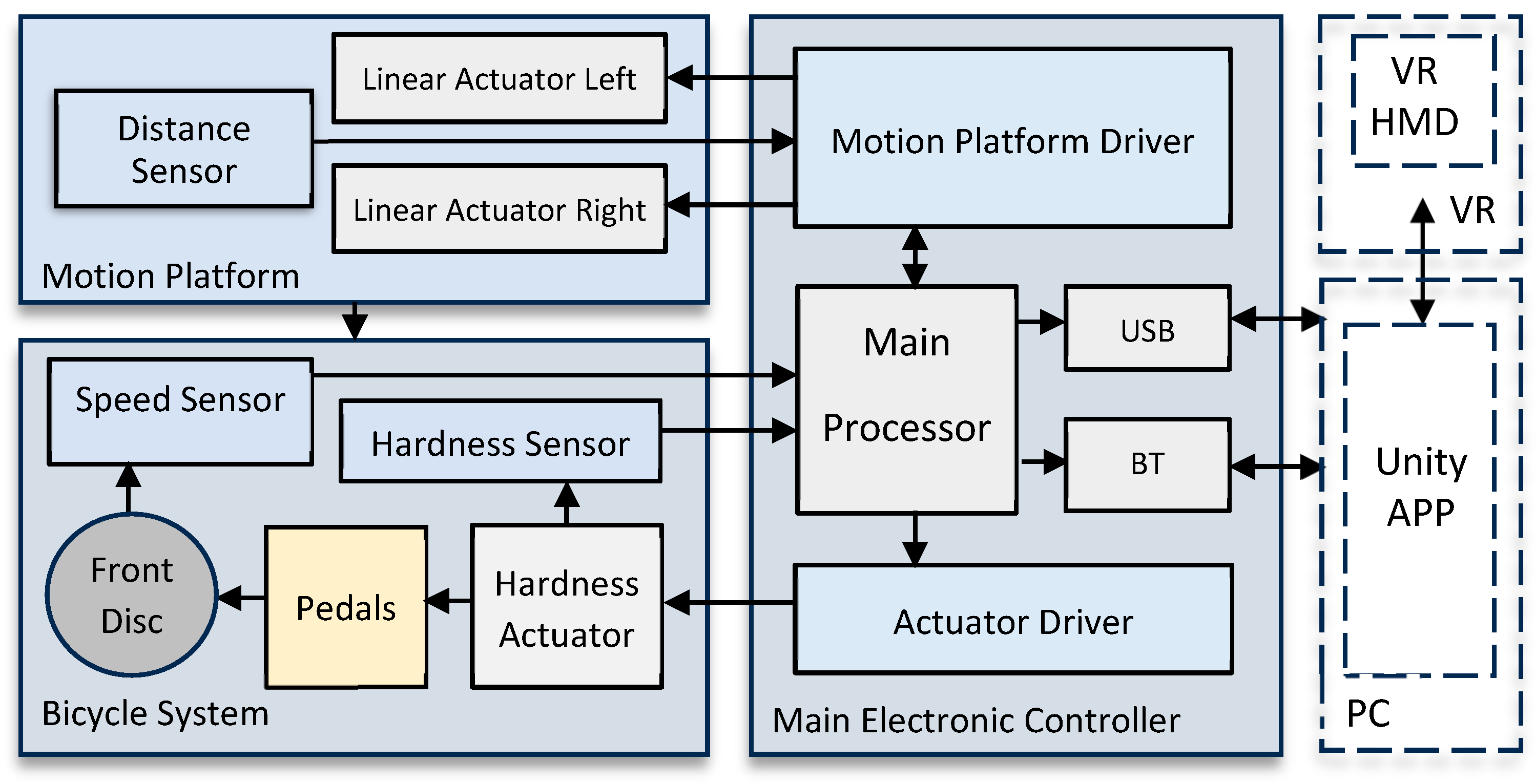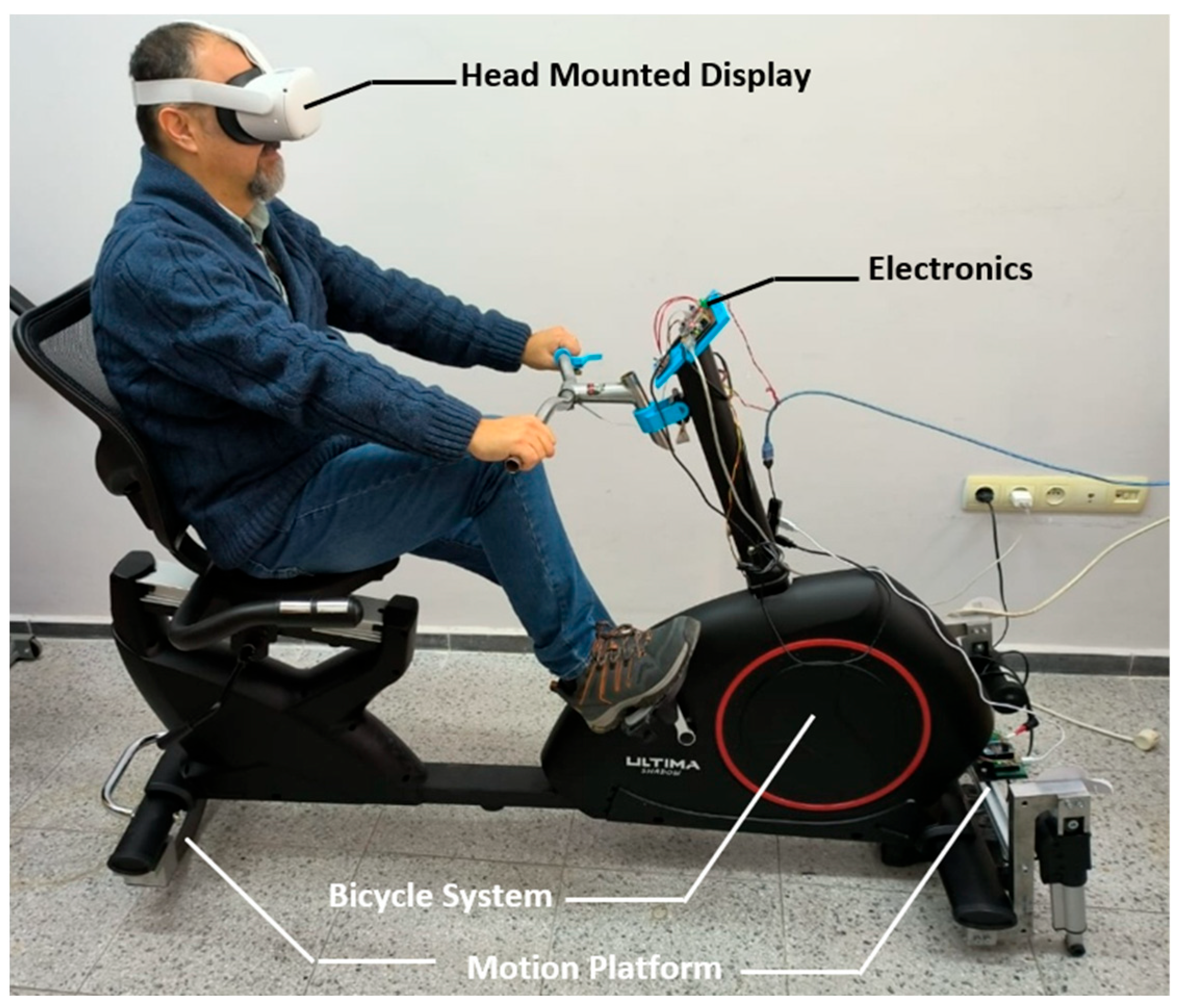 In this study, the entire system was designed to be controlled by an operator and can be used independently. The bicycle and motion system were built together with the electronic design and are controlled by it. All electronics are connected to the operator’s computer via USB port or wireless Bluetooth. The Meta Oculus Quest II Headset receives a stereo image via computer with Airlink, as shown in Figure 12.