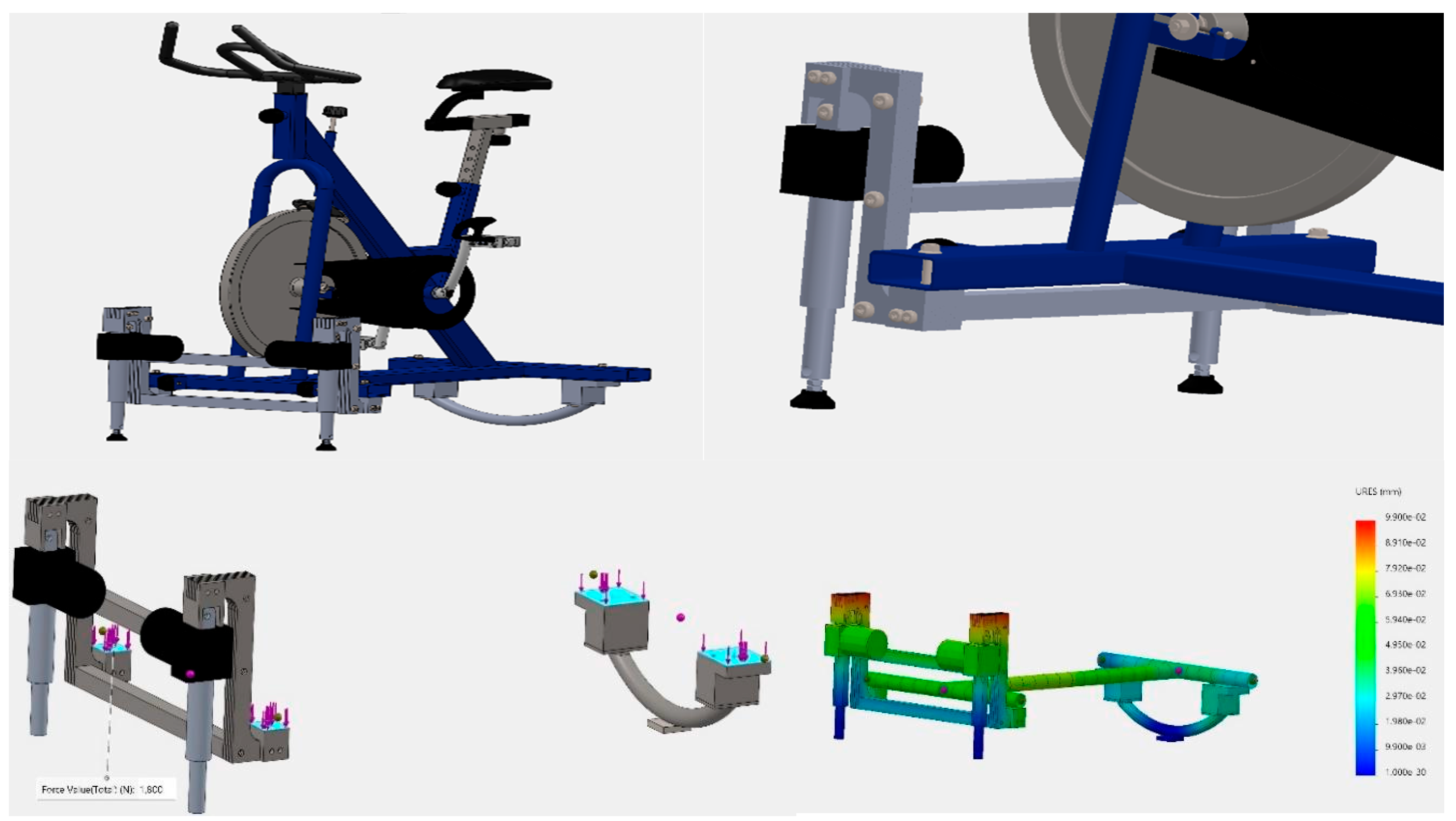 The kinematic relations required for the mechanical system are calculated with a geometric approach to determine the angle between the center and front center points. The design was made according to the prediction that the actuators could operate under a total load of 5000N. Because the exercise bike weighs 100 kg, and the person on it weighs 80 kg on average, the factor of safety (FoS) was determined with a ratio of requirement of 2–3 times the above. In the study, the mechanical design of the motion system was tested in a simulation environment, and its compliance with these safety requirements was also analyzed. According to these simulation results, the total load of 1800 N applied to the pivot at the front and rear center points carried by two actuators with a capacity of 5000 N shows that the system can operate with a factor of safety (FoS) = 2.78. The simulation analyses are shown in Figure 6.