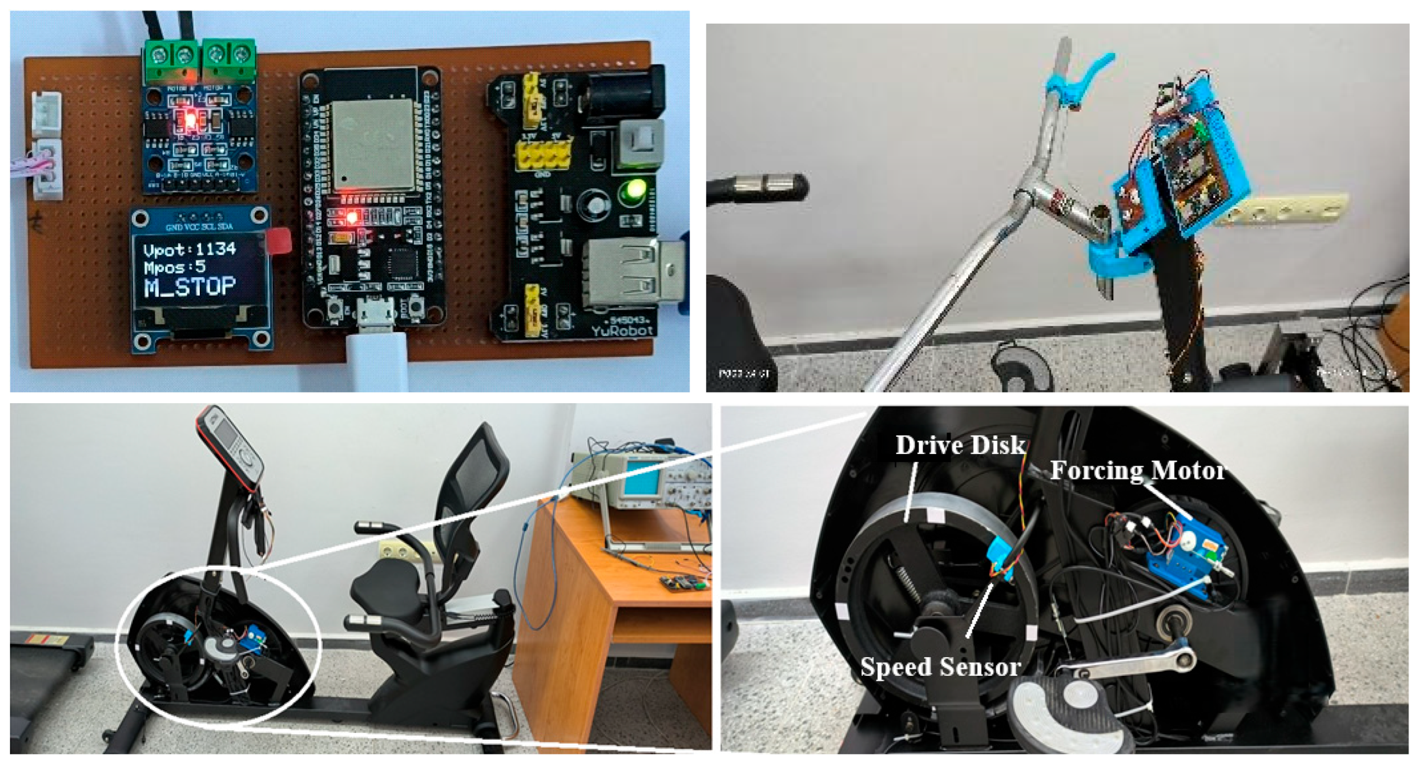 To provide realistic responses for the advanced applications planned in the study, the electronic control system required additional structures not present on the bicycle from Ultima, İstanbul, Türkiye. These include the sensor structure measuring the speed of the front drive disk, the circuit measuring the brake lever on the free handlebar, the sensor and driver module controlling the position of the DC forcing motor, the circuit driving the linear actuators of the motion platform, the processor card providing communication with the external computer system, and the embedded software. All these additional components were designed and implemented to be controlled from a single card. This electronic control card and the system subcomponents are given in Figure 9 below.
