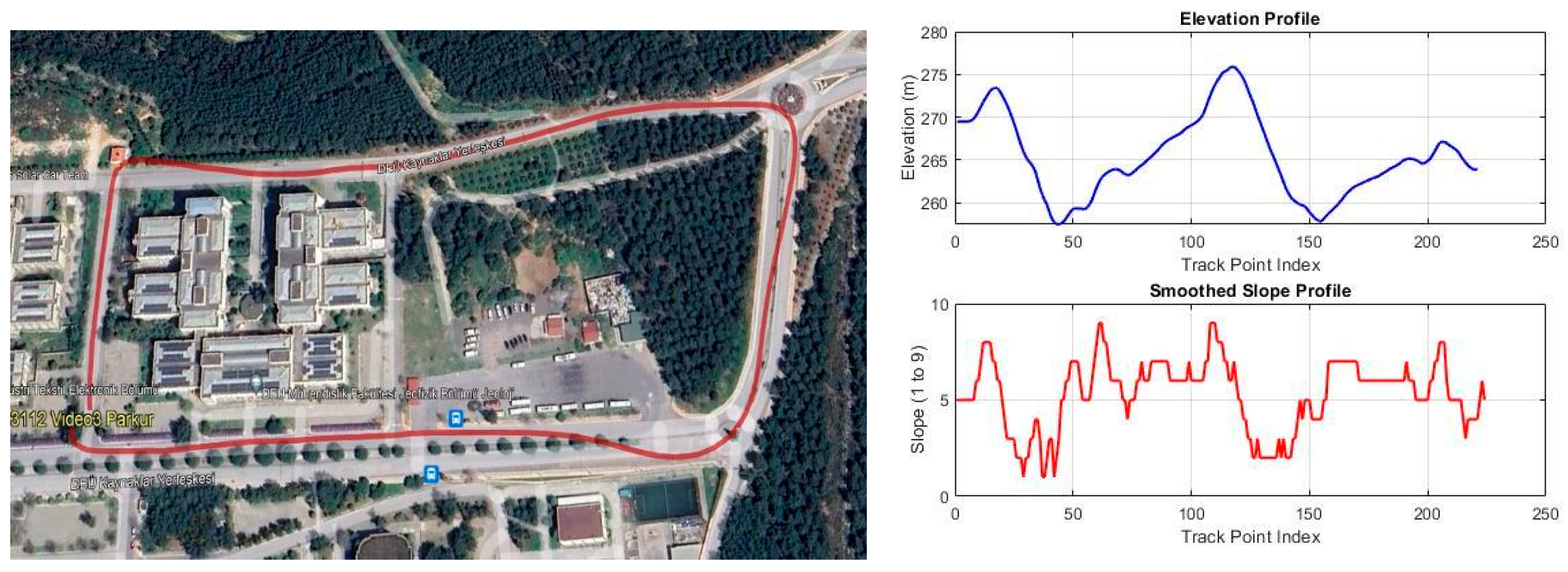 The enhanced reality application aims to produce a more realistic sense of reality in the user using real track data with motion feedback. Real track data mainly consist of 360-degree video recordings of a real environment that can be viewed in a bicycle-like manner in terms of the head height and viewing angle. For this purpose, a bicycle driver used a 360-degree head-mounted camera, and tracks were recorded with this view. Four sample parkour videos and slope data were produced in this study. For example, the track given below was recorded on a small slope parkour around buildings at Dokuz Eylül University, Tınaztepe Campus, Buca, İzmir region. Sample track recordings are shown below in Figure 10 and Figure 11. The records contain gyroscope and embedded GPS data. In this way, real pitch and roll movements can be repeated by the motion platform on the system while using processed slope data.