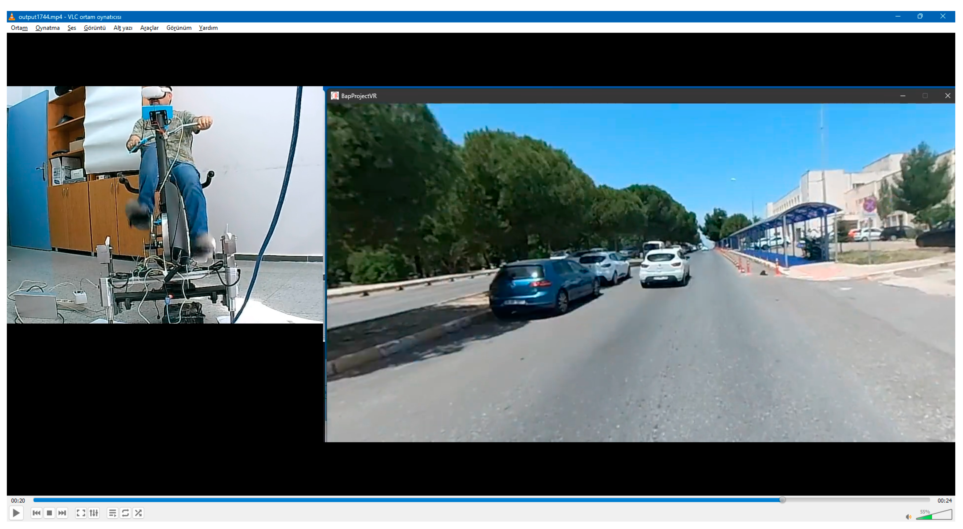 The software plays 360-degree videos mainly according to the head movements within the surface of a virtual sphere. Depending on the tilt information related to the recorded video frame, the motion platform moves, and depending on the speed information from the bicycle disk sensor, the 360-degree video player is controlled by the Unity engine. Only the part of the video that fits the human’s perspective is reflected on each eye. The output image of the video played by the Unity game engine and Visual Studio program controlled by the project control computer are shown in Figure 12. Here, the control menu on the PC, the video image flowing in the control window, and the stereo image of the VR headset are displayed, as shown in Figure 13.