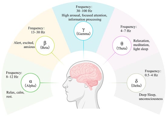 EEG measures the electrical activity of the cerebral cortex and serves as a crucial tool for studying cognitive and emotional processes, as shown in Figure 2. Early neuroscience studies demonstrated that the spectral characteristics of EEG signals vary across different emotional states. For example, alpha-band power increases during calm or relaxed states, while high-frequency beta band activity is enhanced under stress or arousal [24,25]. Contemporary emotion recognition research leverages these features by employing machine learning algorithms to classify EEG signals and identify dimensions such as valence and arousal. A common approach involves mapping emotional models onto the two-dimensional Russell circumplex (valence arousal plane) or the three-dimensional Mehrabian PAD model (Pleasure, Arousal, Dominance), extracting power spectral density or nonlinear features from the EEG, and then training classifiers to discriminate between emotional states [26,27]. Parallel studies in China have also explored this domain, for instance by applying deep learning techniques to EEG-based emotion classification [28,29].