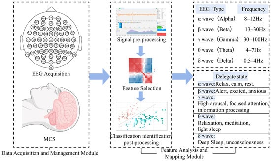 The EEG processing workflow consists of two main modules: data acquisition and management, and feature analysis and mapping, as shown in Figure 5. For data acquisition, this study simulates MCS conditions using healthy volunteers to generate EEG signals, aiming to validate the system’s feasibility. The experiment employed the NeuroSky device to record EEG data. A multi-scenario emotion induction paradigm was introduced, in which volunteers were exposed to various emotional stimuli, such as listening to family conversations and public narratives, to evoke distinct emotional states.