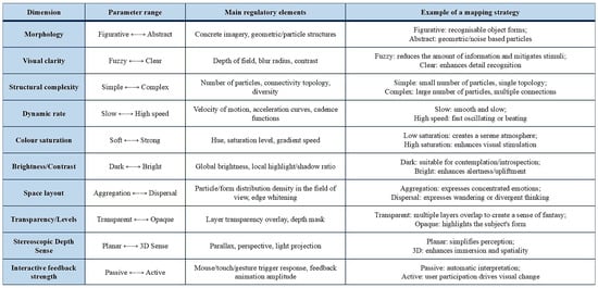 Emotion visualization is designed to convey users’ subjective emotional states through intuitive visual means and has recently attracted widespread attention in human–computer interaction, affective computing, and digital art [31,32]. This approach maps physiological signals, such as EEG and heart rate variability, onto visual elements like color, shape, or particle motion to present emotions directly. In visual design, warm hues typically signify excitement or pleasure, whereas cool hues denote calmness or sadness [31]. Wearable devices and EEG acquisition technologies provide the data foundation for emotion visualization. For instance, Marín Morales et al. combined EEG and heart rate data to enable real-time emotion recognition and dynamic feedback within virtual reality environments, thereby supporting emotion regulation and immersive interaction [33]. Moreover, recent research has converted physiological signals into artistic graphics for mental health interventions and art therapy, fostering emotion externalization and self-reflection [34]. By fusing multimodal sensing with dynamic visual expression, emotion visualization not only enriches human–computer interaction experiences but also shows broad potential applications in psychological healing and digital art.