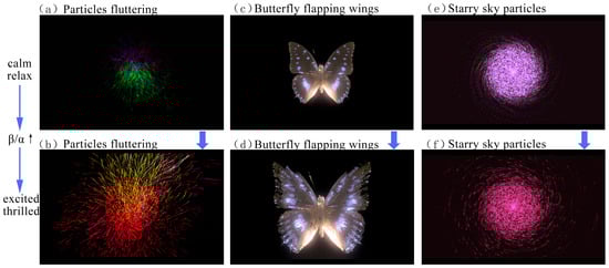 - In the fluttering particle scene, relaxed emotions were depicted through blue-green particles moving in smooth, low-frequency oscillations, exhibiting periodic motion patterns. In contrast, excited states were represented by red particle streams with increased speed and turbulence effects, signaling heightened arousal.