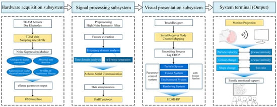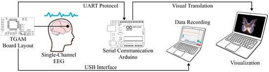The technical implementation of this study consists of three main subsystems: the EEG acquisition subsystem, the signal processing subsystem, and the visualization subsystem. Together, these components enable the real-time acquisition, processing, and visual representation of EEG signals, as shown in Figure 9.