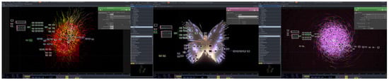 In the preliminary implementation, three representative visual scenes were designed to verify the system’s expressive capacity: fluttering particles were used to represent a relaxed, low-tension emotional state; butterfly wing flaps symbolized aroused, active emotions; and starfield particles conveyed a sense of tranquility and deep contemplation. Each visual unit was dynamically driven by simulated EEG data in real time using Python 3.11 scripts or CHOP nodes. Through expression mapping and logical operations, these visuals rendered the shifting states of consciousness across different emotional dimensions in MCS patients. This approach provides both a perceptual and technical foundation for future emotional intervention experiments and user experience evaluations, as shown in Figure 7.