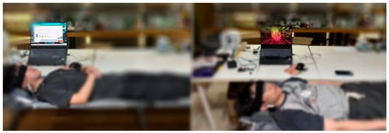 Before the experiment, six participants were guided individually into a quiet, comfortable room with soft lighting. Following a standardized procedure, the experimenter fitted each participant with EEG equipment, ensuring proper contact between electrodes and the scalp to guarantee accurate and stable data acquisition. Participants were then instructed to lie on a specially designed bed frame, simulating an MCS. They were asked to relax, maintain a calm state, and acclimate to the experimental environment for approximately one minute. The experimental setting and participants are illustrated in Figure 11.