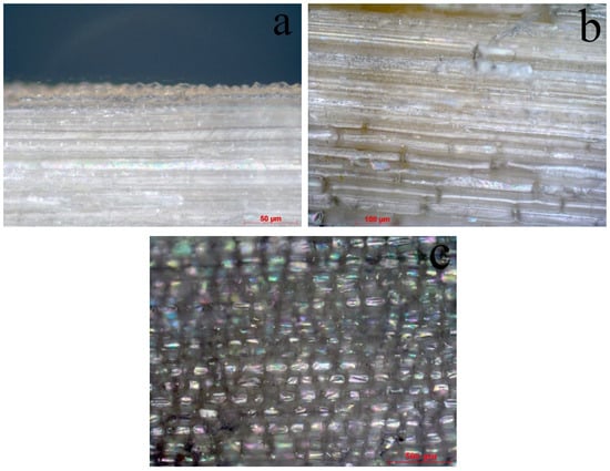 After cooking, the mixture of miscanthus and lye was ground in a CGA mill for 5 min. The degree of grinding after fiberization was 14–15 °SR, and after secondary grinding was 20–22 °SR. Figure 5 shows microphotographs of sulfate HYP fibers from miscanthus.
