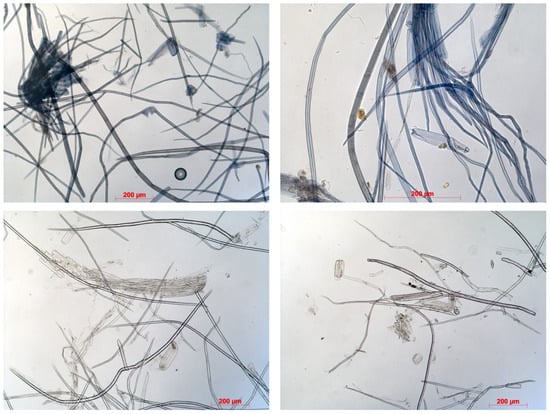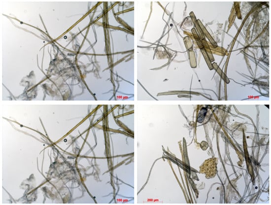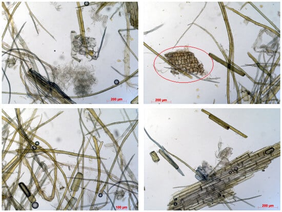 To obtain CTMM from miscanthus, an alkali treatment was used—3% white kraft liquor. In this case, approximately 71% of the fiber mass was extracted from the stems. The Kappa number was 88 and the spent alkaline solution had a pH of about 11.0. After steaming, the mixture of miscanthus and liquor was ground in a mill for 15 min. The degree of grinding of the mass after fibering was 14–15 °SR. The mass was characterized by high shivery, which was removed after processing the mass on a Sommervile apparatus (Rycobel Group, Deerlijk, Belgium, Sommervile SM-21 fiber classifier). Figure 6 shows micrographs of CTMM from miscanthus.