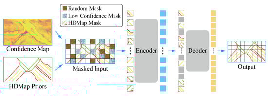 The input masked map is generated through dataset preprocessing, obtained through HDMap confidence estimation (as shown in Figure 3) and random masking operations.