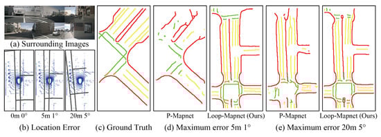 SDMap mapping quality under different localization errors at 120 × 60 m perception range. (a) Surround-view camera images; (b) SDMap prior position in LiDAR coordinate system; (c) HDMap ground truth; (d) under maximum error of 5m and 1°, both P-MapNet and Loop-MapNet can accurately perceive road intersections at longer distances; (e) under maximum error of 20 m and 5°, due to excessive SDMap prior errors, P-MapNet shows delayed modeling of forward intersections compared to Loop-MapNet.