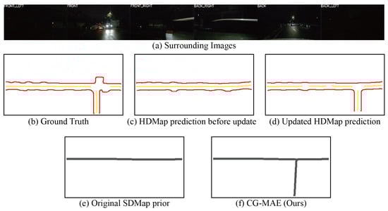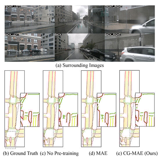 To verify the optimization effect of the confidence-guided masked autoencoder (CG-MAE) on HDMap mapping details, we designed comparative experiments for pre-training models: (1) no-pre-training baseline; (2) traditional MAE pre-training [13,46]; (3) the proposed CG-MAE pre-training. All experiments use the same training cycle (30 epochs) and perception range (120 × 60 m).
