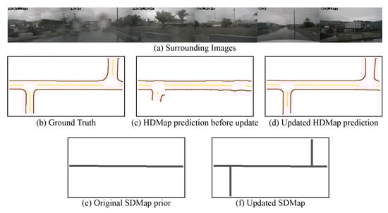 SDMap inference effects under road network changes in rainy, foggy scenarios at 120 × 60 m perception range. (a) Surround-view camera images. (b) HDMap ground truth. (c) HDMap inferred using the original SDMap prior. (d) HDMap inferred using the updated SDMap prior. (e) The original SDMap prior. (f) The updated SDMap after traversal.