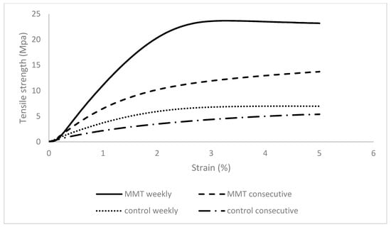 The rheological memory indices of the different treatments are presented in Figure 1, while representative tensile strength–strain curves are presented in Figure 2. In all cases (the only exception being the non-reinforced sample subjected to 7% elongation for 2 min), the rheological memory indices were higher than 1, signifying that the tensile strength of the weekly elongation was higher than the tensile strength of the consecutive elongation. This result was more notable in the case of nanoclay reinforcement, showing that the presence of nanoclay had a significant effect on strain hardening; even in the case of samples subjected to 5% elongation for 2 min, where the rheological memory index of the nanoclay-reinforced sample was lower than the rheological memory index of the non-reinforced sample, the values were very close. The increase in the stress duration (from 2 min to 5 min for 5% elongation) resulted in higher rheological memory indices, particularly in the case of the nanoclay-reinforced sample. No specific effect could be observed regarding the effect of increasing the stress level (from 5% to 7% elongation for 2 min), since in the case of the non-reinforced sample, there was a reduction, but in the case of the nanoclay-reinforced sample, there was a slight increase.