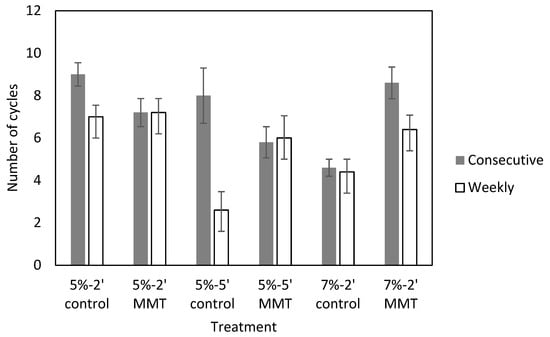 The number of cycles that each treatment underwent until break is presented in Figure 3. In general, samples that underwent consecutive elongation lasted for more cycles until break compared to the samples that underwent weekly elongation. There were only two exceptions: the nanoclay-reinforced sample subjected to 5% elongation for 2 min, where the number of cycles was equal for both the consecutive and weekly stress regimes; and the nanoclay-reinforced sample subjected to 5% elongation for 5 min, where the number of cycles was higher for the weekly stress regime. This result is in good agreement with the rheological memory index result, because, since the rheological memory index is higher than 1, samples that underwent the weekly stress regime became tougher than samples that underwent the consecutive stress regime; thus, they became less flexible, and therefore, lasted for fewer cycles until break. The difference between the number of cycles of the consecutive and weekly stress regimes was less notable for nanoclay-reinforced samples, indicating that the presence of nanoclay plays a role in the strain hardening phenomenon. Both the increase in the stress duration (from 2 min to 5 min for 5% elongation) and the increase in the stress level (from 5% to 7% elongation for 2 min) resulted in a reduction in the number of cycles until break. This is expected because both increases contributed to the strain hardening phenomenon, resulting in tougher films, which were less flexible and withstood a lower number of cycles until break.