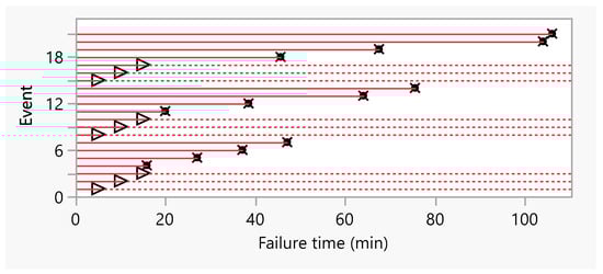 Event plot of experimental units vs. failure time, where ──x stands for specific failure time (uncensored unit), and ──▷----- stands for censored elements in which the failure time is impossible to record.