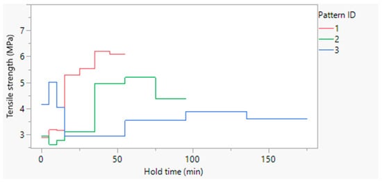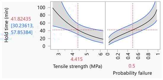 As shown in Figure 7, increasing the hold time at which the unit is subjected to stress, caused a decrease at the tensile strength, and therefore, an increase in the probability of failure. A 50% probability of failure of the units is reached when the tensile strength is 4.415 MPa for a hold time of 41.8 min.