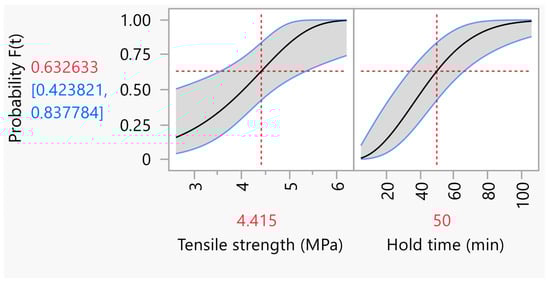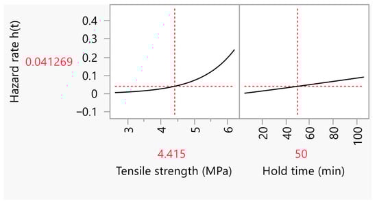 In Figure 8, an upward trend in the hazard rate is observed, which demonstrates the failure of the experimental units as both the tensile strength and hold time increase. These results are verified by the parameter β = 2.060, obtained from the analysis of the Weibull model, which describes a linear variation in the risk rate. If the hold time of the experimental units is set to 50 min, the hazard rate tensile strength is 4.13% with a tensile strength of 4.415 MPa. If the applied tensile strength increases above the value of 4.415 MPa, the instantaneous hazard rate undergoes an exponential increase.