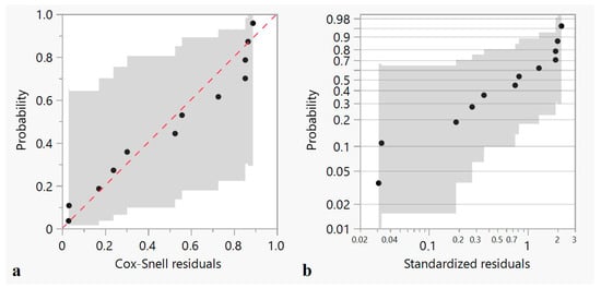 The reliability of the linear model is confirmed by the trend of the Cox–Snell residuals to closely surround the diagonal line (Figure 9a) and by the linear arrangement of the standardized residuals, since all points except for the first and the last one meet the requirements of normality (Figure 9b).