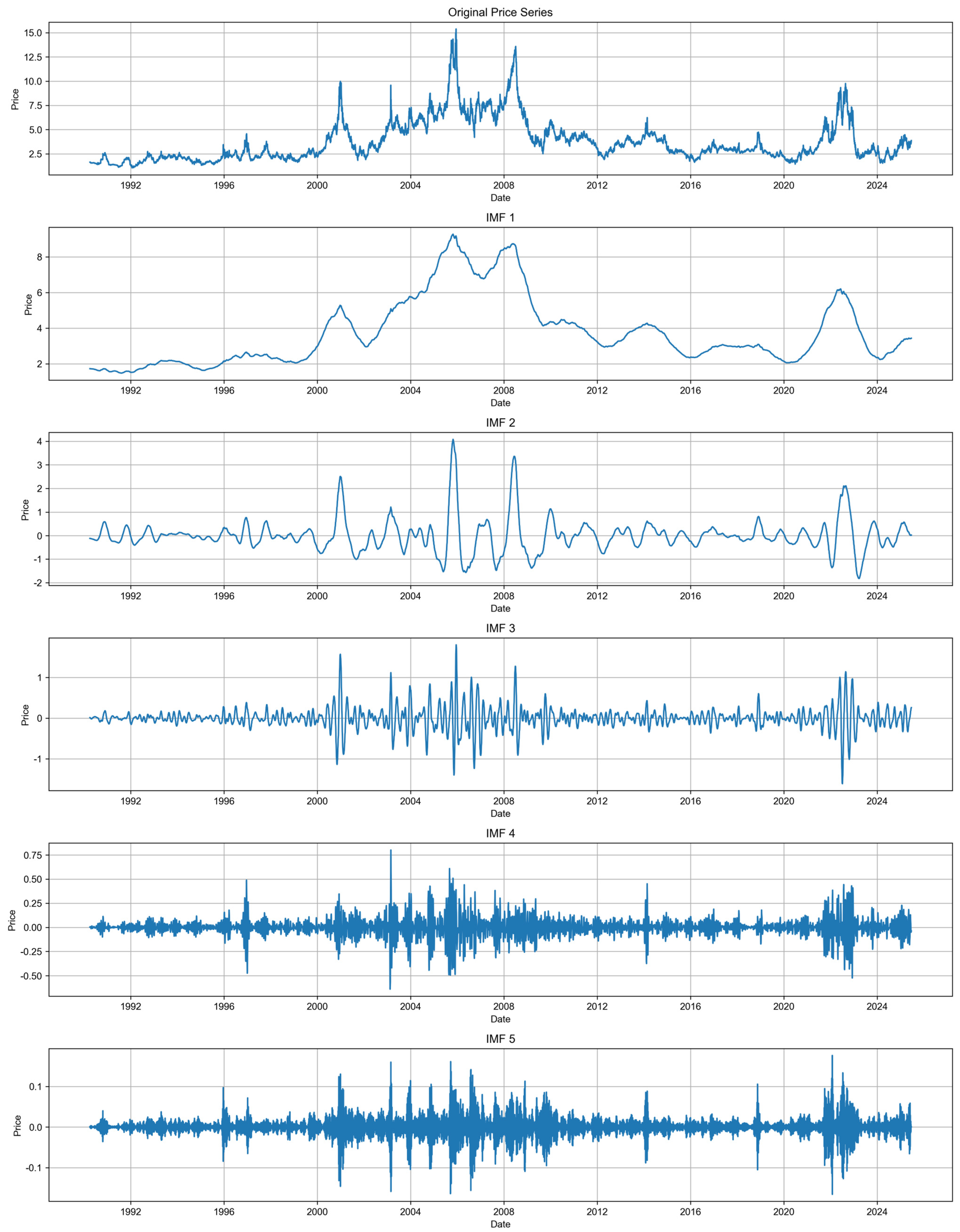 Therefore, K = 5 provides an appropriate balance between feature extraction integrity and computational feasibility. It allows the model to capture multi-scale characteristics of natural gas price dynamics—from short-term high-frequency fluctuations (e.g., intraday supply–demand disturbances) to medium- and long-term variations (e.g., seasonal cycles and macroeconomic influences)—without introducing redundant components. Accordingly, this study adopted K = 5 as the mode number for VMD decomposition. The decomposition results for daily NYMEX prices are shown in