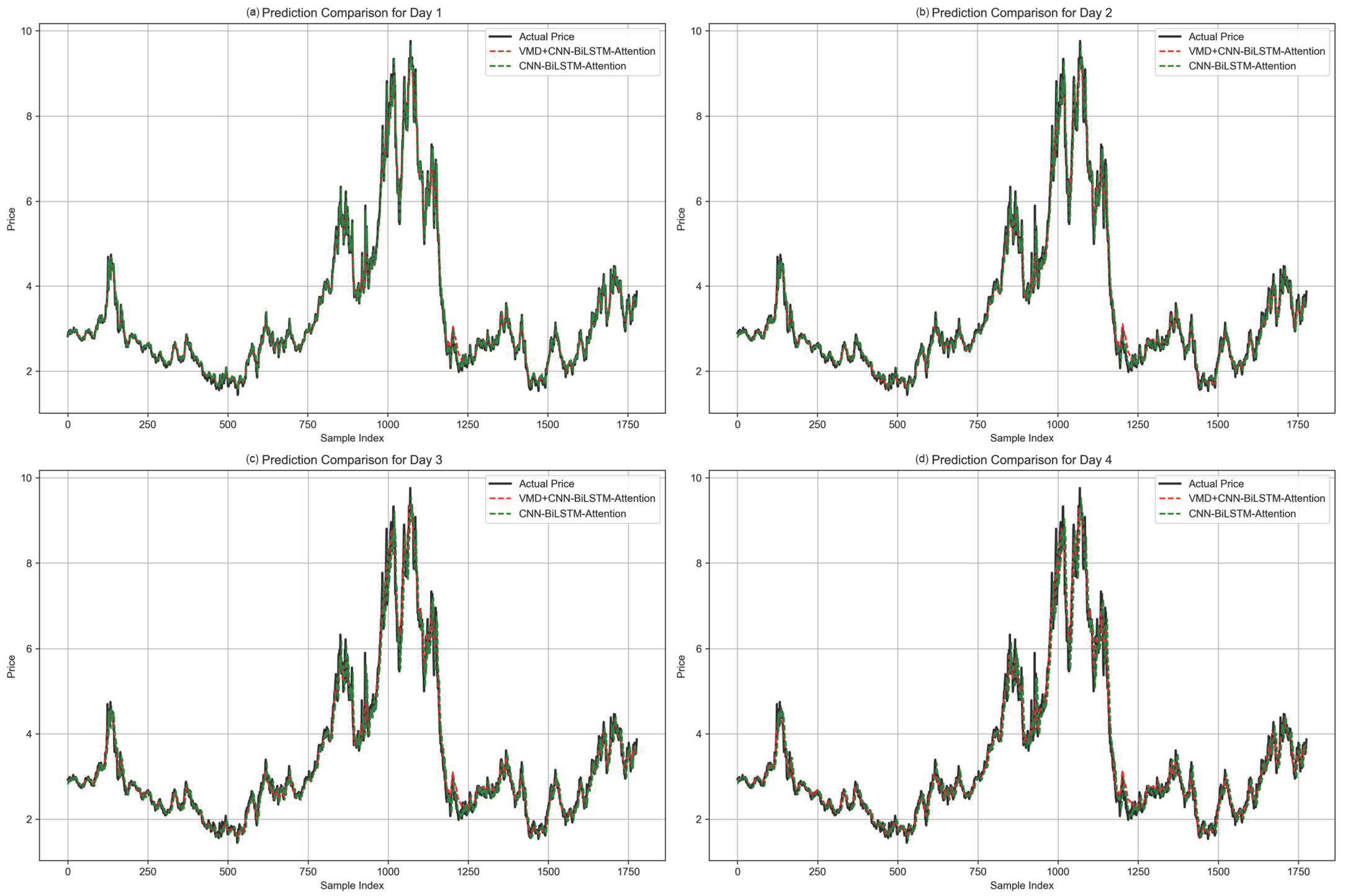 In the comparative experiment on 1–4-day short-term price prediction, an in-depth analysis was conducted on the performance differences between the VMD-CNN-BiLSTM-attention and CNN-BiLSTM-attention models. The results indicate that in the 1-th Day Ahead prediction scenario, although both models can initially capture the temporal evolution trend of prices, the hybrid model integrated with VMD performs better. Its core advantage lies in the implementation of multiscale mode decomposition on the nonstationary futures price sequence through VMD technology, which effectively separates and mitigates noise interference and fluctuation coupling in the original data. This provides purer and more representative input features for the subsequent local feature extraction by the CNN module, long-term dependency capture by the BiLSTM module, and key information focusing by the attention mechanism, ultimately achieving a higher degree of fitting between the prediction curve and actual price.