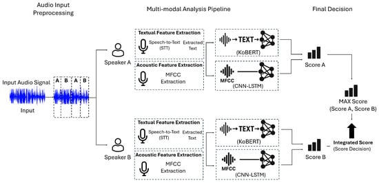 Overall architecture of the proposed multimodal voice phishing detection system. The system applies speaker diarization to separate speakers and then performs parallel analysis using a text-based and an audio-based detection model.