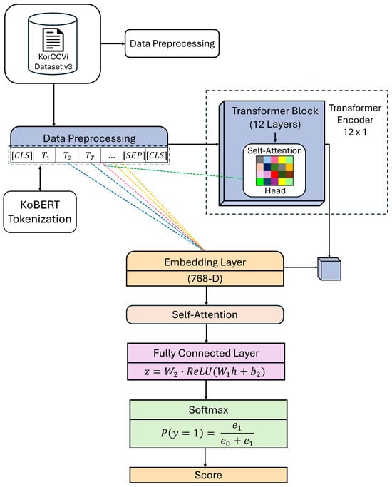 Architecture and data flow of the KoBERT-based text classification model used in this study.