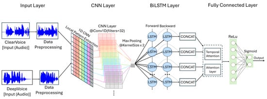 To determine whether a given utterance is genuine or artificially generated, we designed a hybrid classification model that integrates convolutional neural networks (CNNs) with bidirectional long short-term memory (BiLSTM). As shown in Figure 3, the model combines acoustic feature extraction, temporal sequence modeling, and an attention mechanism to capture both local and contextual patterns associated with synthetic speech.
