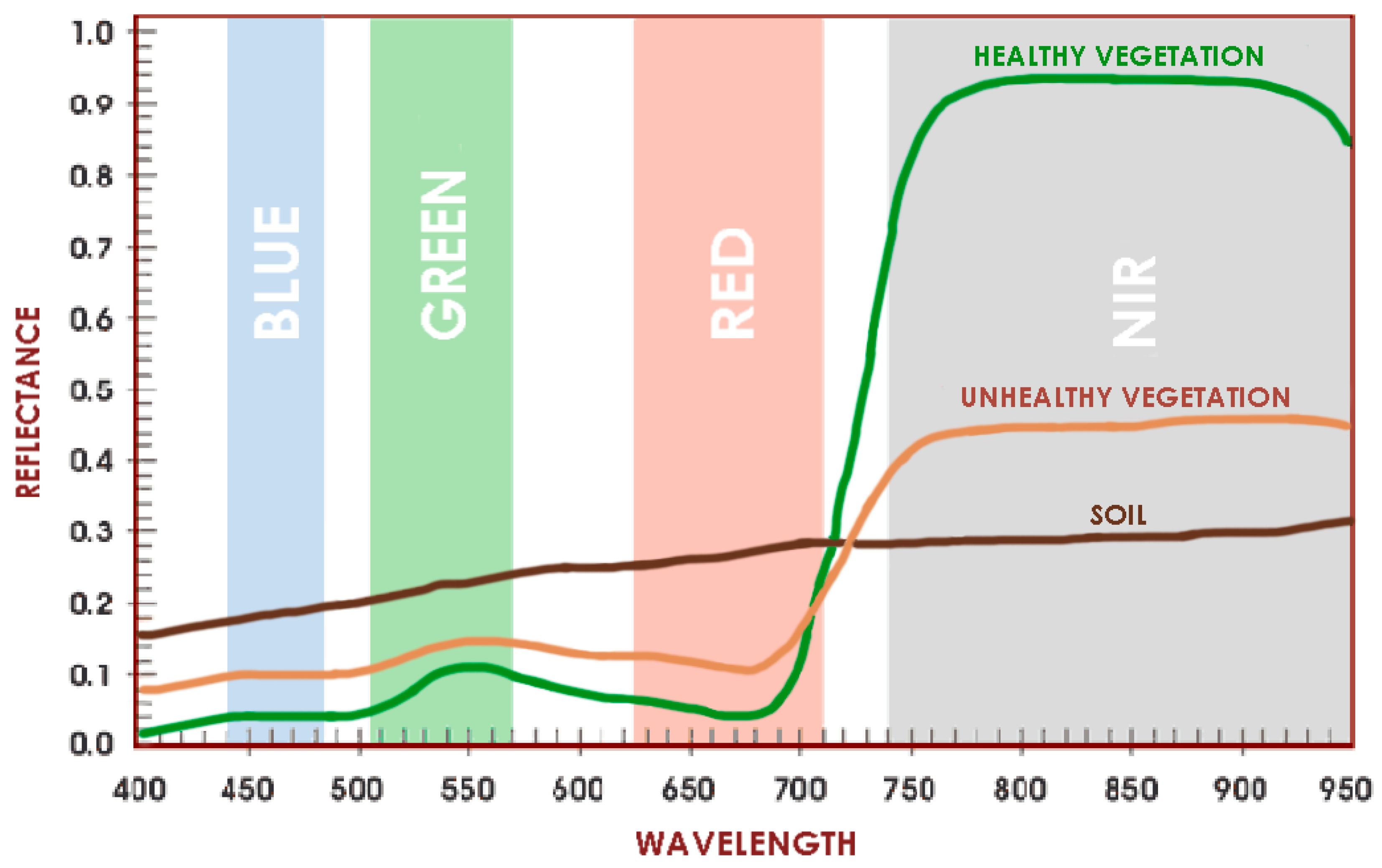 Figure 1) shows a minimum of reflectance in the visible spectrum (400–700 nm), with a peak of reflected energy in the green band at 500–600 nm, known as the ‘green bulge’ of healthy vegetation. The Red Edge (700–730 nm) is a sensitive indicator of plant stress, as a stressed plant exhibits very low reflectance in this band. In the Near-Infrared Spectroscopy (NIR) band (700–1400 nm), reflectance increases dramatically in healthy vegetation, and monitoring this is a way of determining how healthy a crop is, since stressed vegetation reflects significantly less in the infrared range. Similar to the red spectral band, the infrared range is widely used to calculate most vegetation indices in agriculture [