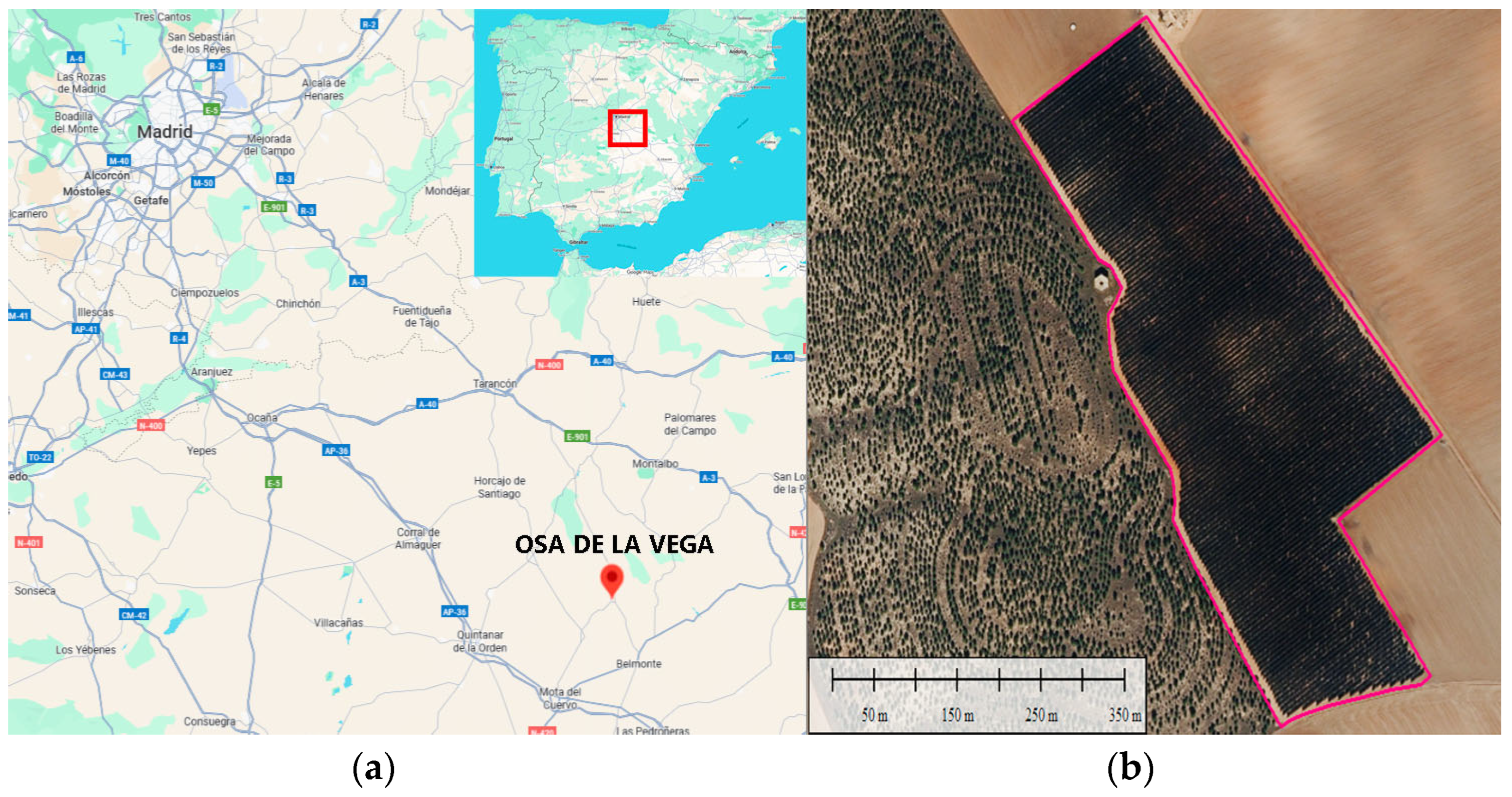 This study was carried out in a super-intensive olive plantation (Cornicabra variety) in Osa de la Vega, Cuenca, Spain (39°40.2′79″ N, 2°42′44.02″ W). The farm has an area of 10 hectares containing 11,104 trees distributed in rows, with a distance of 3.5 m between rows and 1.25–1.5 m between trees (