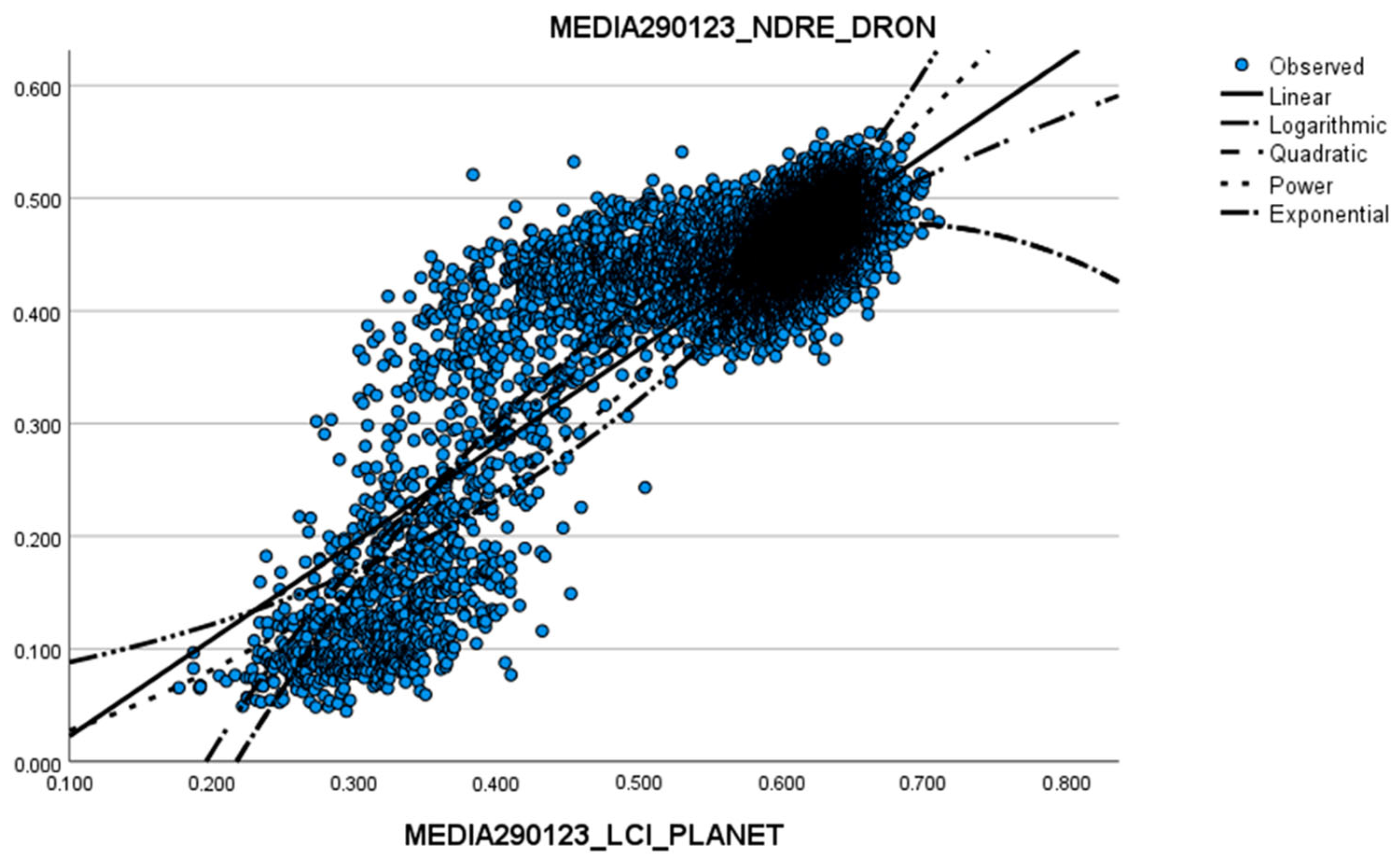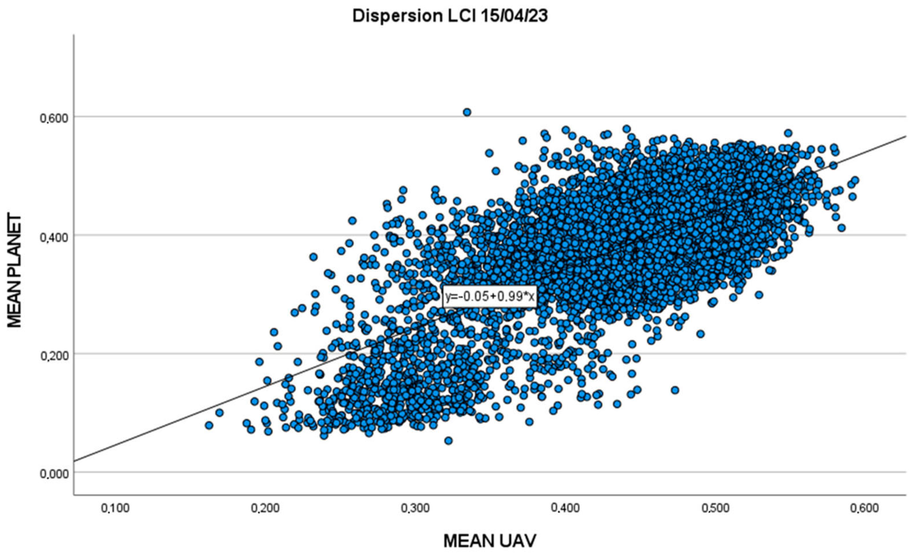 Table 10), only one of the models, NDRE_UAV = −0.063 + 0.859 × LCI_Planet (