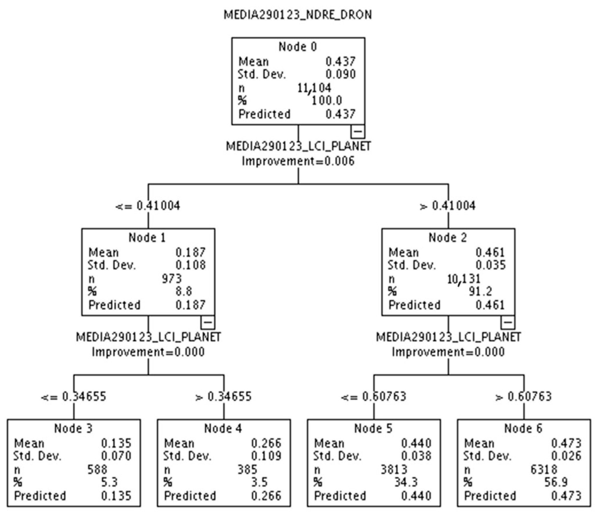 In decision trees, the satellite variables with the highest predictive power were NDRE and LCI. This is consistent with their sensitivity to photosynthetic activity and leaf chlorophyll content.