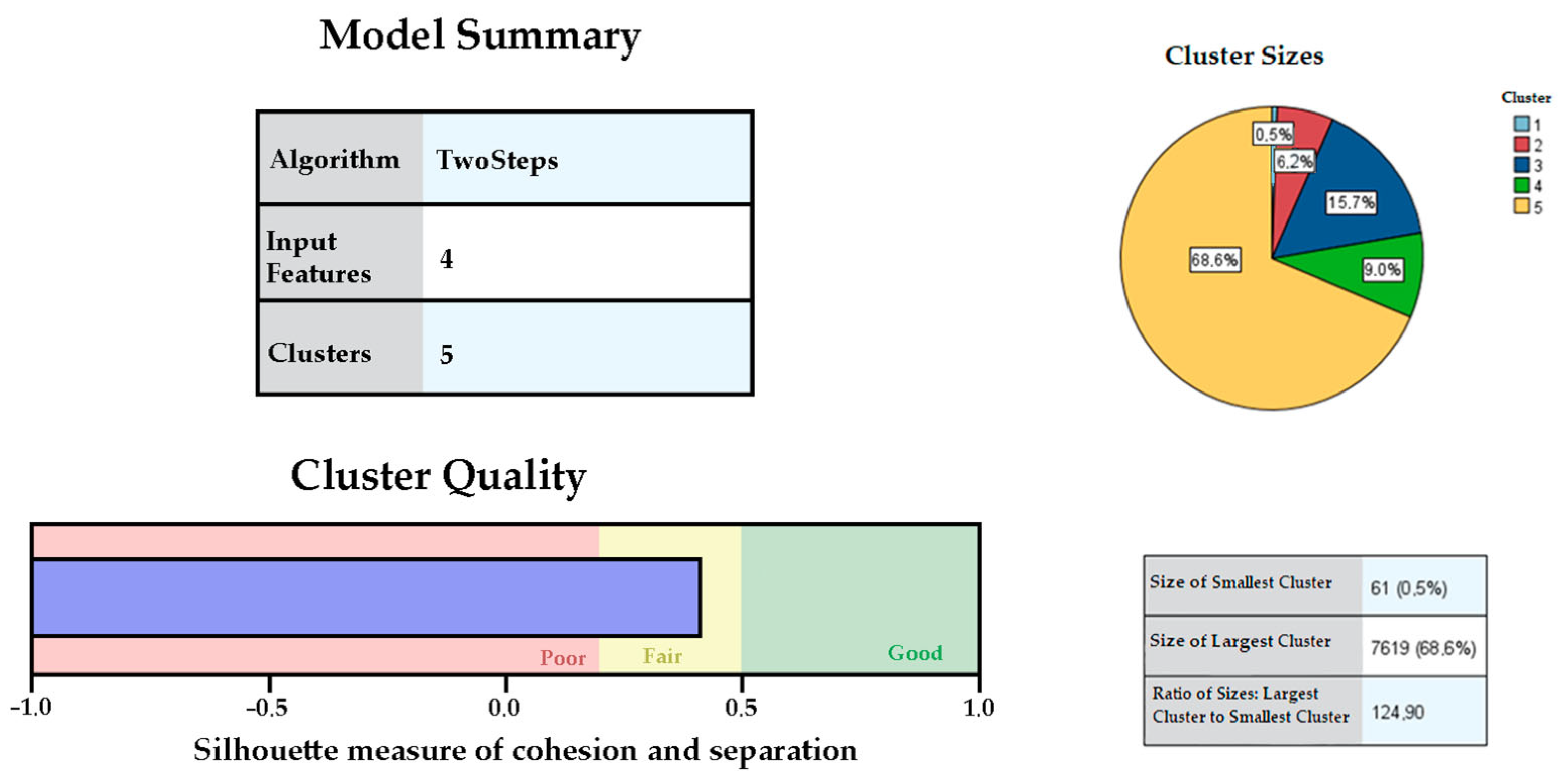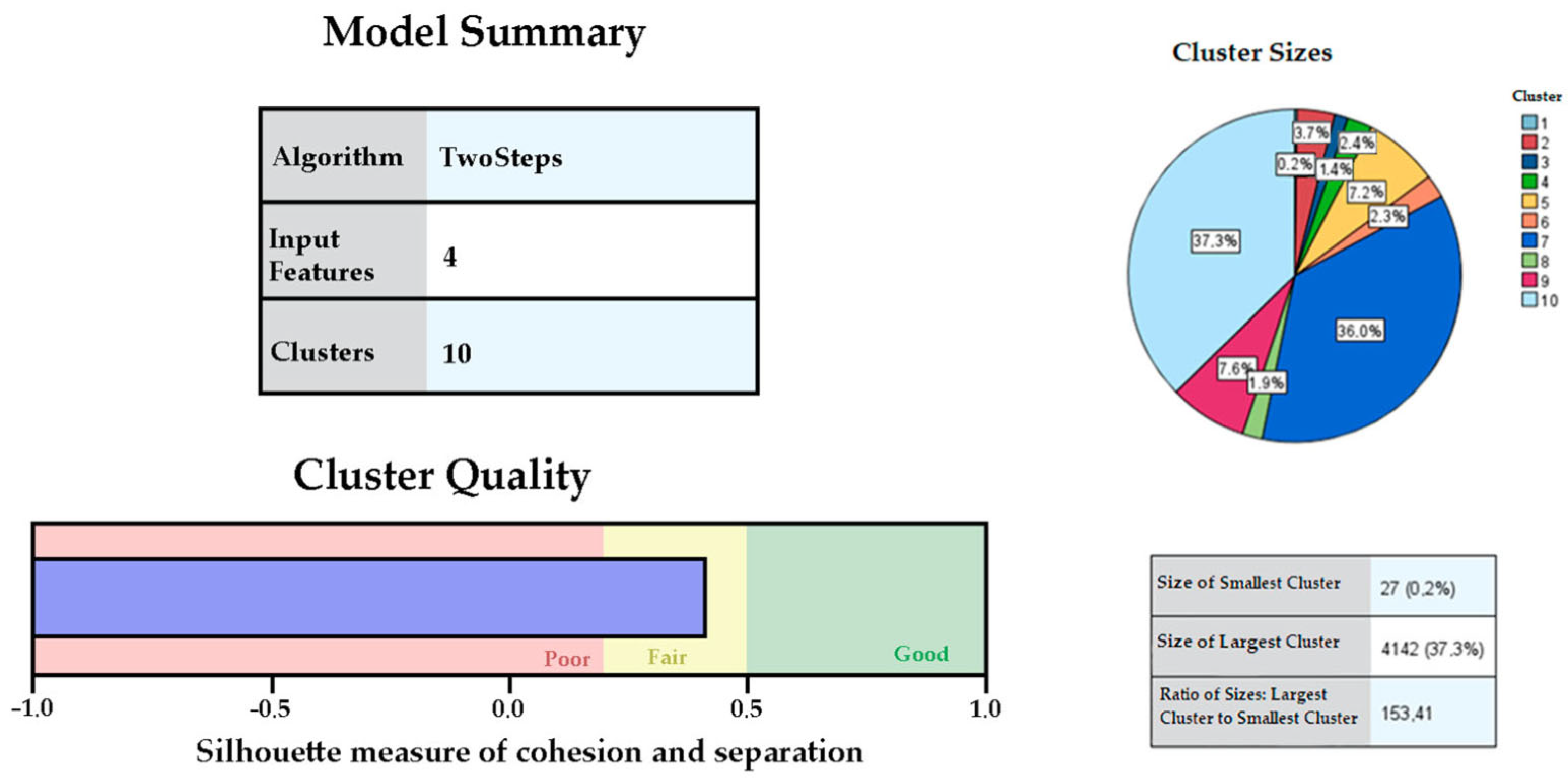 For the April case study of Planet, it was observed that the difference in cohesion measures between five and ten zones is very similar (0.4). However, the size of the groups was, for five clusters, 7619 individuals, i.e., 68.6% of the cases, generating poor zoning due to the existence of extreme values that needed to be considered. Analysing the zoning in ten clusters resulted in a better distribution of the data, with the largest group size being 4142 individuals, corresponding to 37.3%. It was therefore decided to use the 10-cluster classifications.